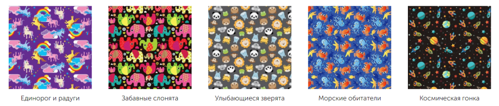 На выбор доступны 5 вариантов забавных рисунков на чехлах для боковых опор, поддержек таза, туловища, головы и столика